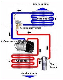 Verdamper: In de verdamper wordt het koude middel weer gasvormig. Door de drukverlaging gaat het koken en ontrekt warmte aan de lucht van het interieur. De aanjager blaast de lucht langs de verdamper.